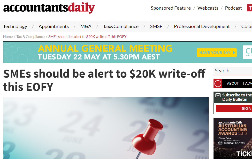 The $20,000 Instant Asset Write-Off is probably the most relevant and widely-used tax benefit to small business, and it may be a term that you've heard lately in the latest Budget. But what does it mean for the average small business? Accountants Daily interviewed us to find out.